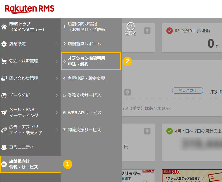 2. 2店舗様向け情報・サービス」、「オプション機能利用申込・解約」の順でクリック